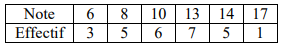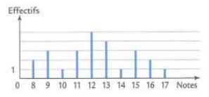 Voici les notes obtenues par 13 élèves à un devoir de mathématiques : 6 ; 8 ; 8 ; 9 ; 9 ; 10 ; 11 ; 12 ; 14 ; 17 ; 18 ;