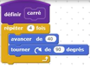 On a défini le bloc ci-dessous pour réaliser un carré. Un deuxième bloc a été créé pour réaliser un rectangle de longueur 80 et de larguer 40.