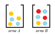 L’urne A contient trois boules jaunes et deux boules bleues. L’urne B contient trois boules bleues, deux boules rouges, une