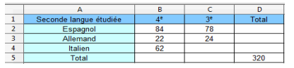 Le tableau ci-dessous, réalisé sur un tableur, permet de déterminer la répartition de la seconde langue étudiée par les 320 élèves