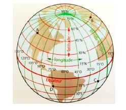 Donner la latitude et la longitude des quatre points A, B, C et D sur le globe terrestre suivant.