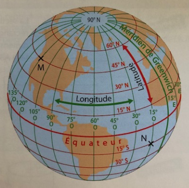 Donner la latitude et la longitude des quatre points M et N sur le globe terrestre suivant.